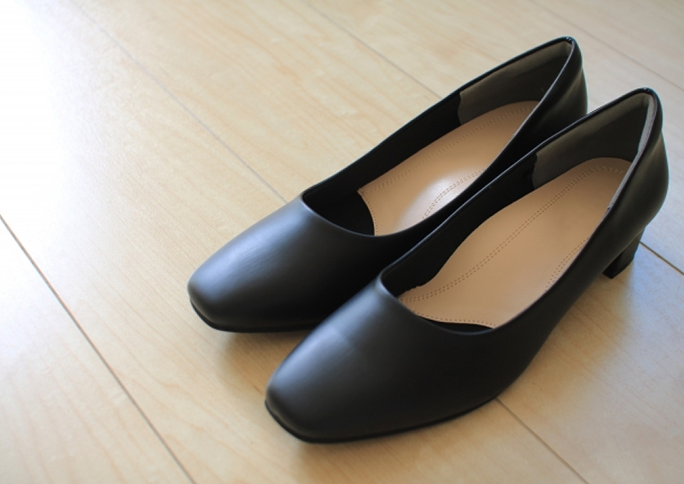 女性は、黒でつま先が閉じる、かかとのある靴が無難です。かかとは高すぎないものが安全です。素材は強い光沢を避け、布や落ち着いた革がよいでしょう。妊娠中や足に不安がある方は、低いかかとを選びます。